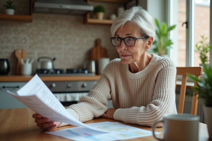 Femme âgée examinant des documents de retraite dans sa cuisine